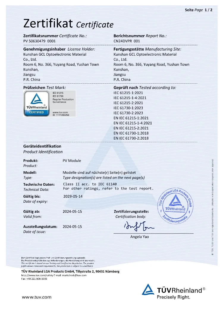 日前, 協鑫光電鈣鈦礦1m*2m單結組件,獲得IEC 61215和IEC 61730組件安全及可靠性認證,本次認證機構為國際獨立第三方檢測、檢驗和認證機構德國萊茵TÜV。